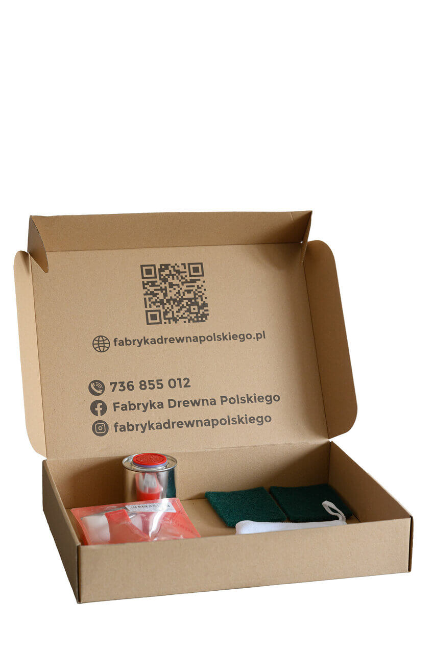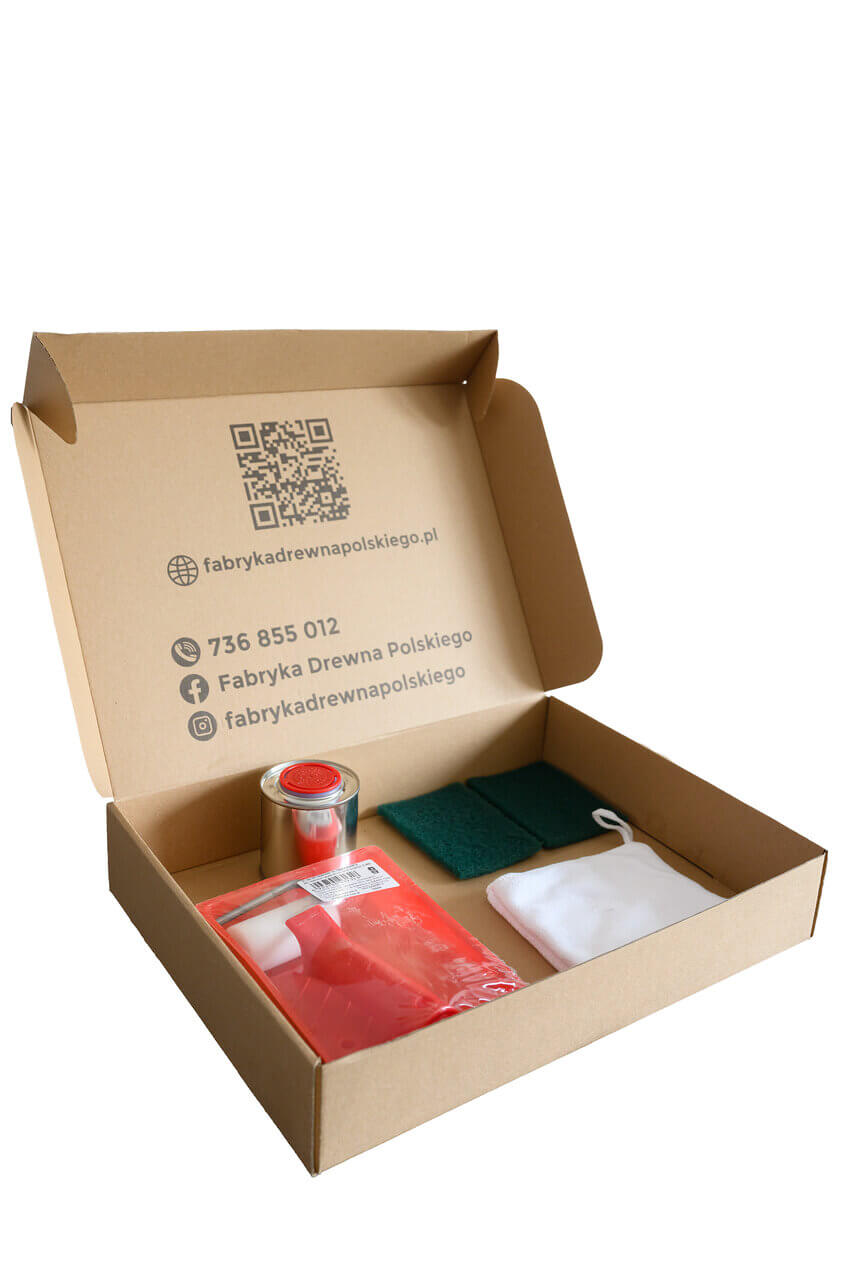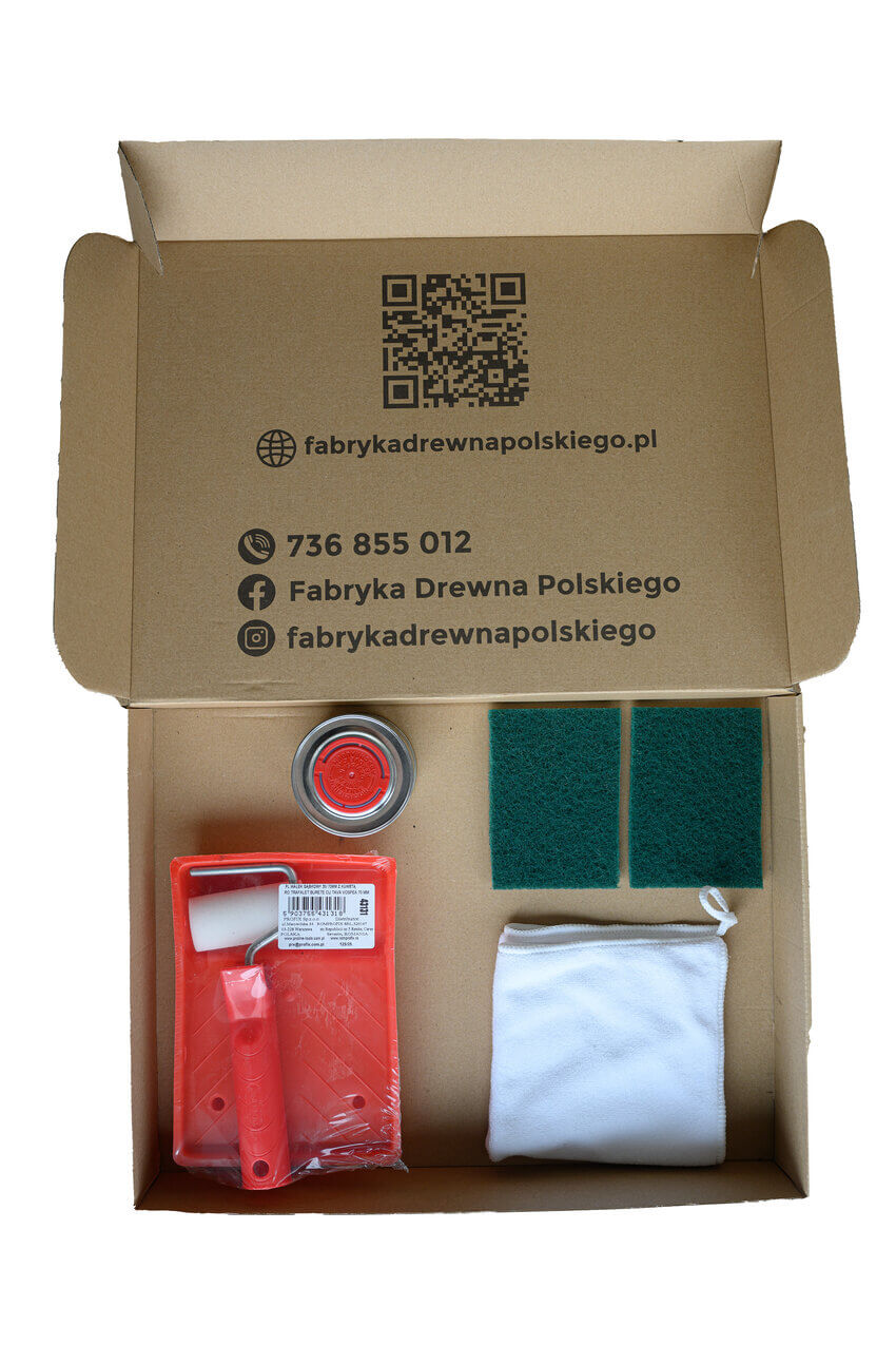Zestaw zawiera: wałek z kuwetą i rękojeścią, pady szlifierskie do matowienia powierzchni, bawełnianą ściereczkę, puszkę oleju twardego, kartę z podstawowymi informacjami oraz instrukcją.